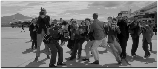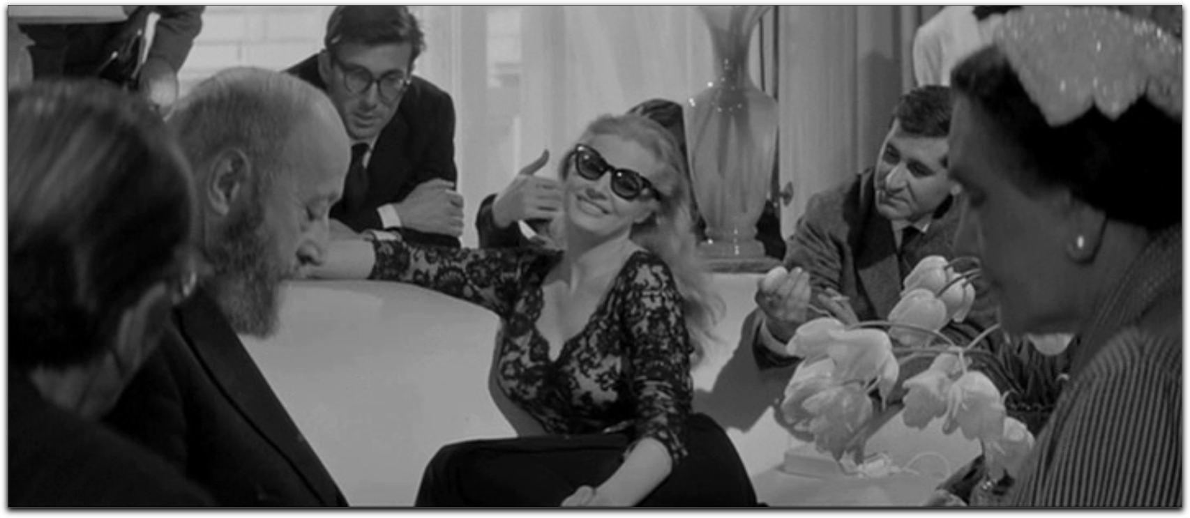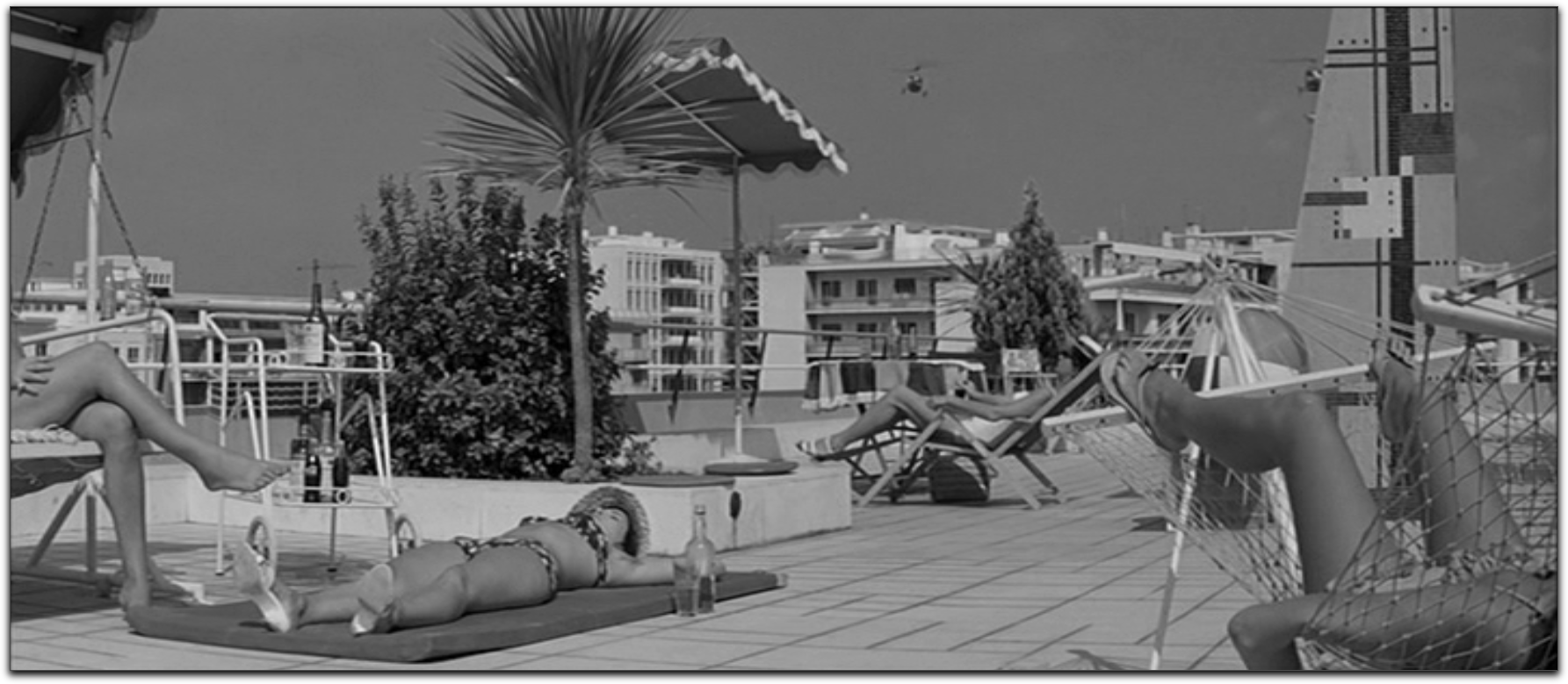 Marcello Mastroianni, as Marcello, a tabloid reporter checks out a bevy of beauties sunbathing on a rooftop. He tries talking to them, but can’t hear what they’re saying.