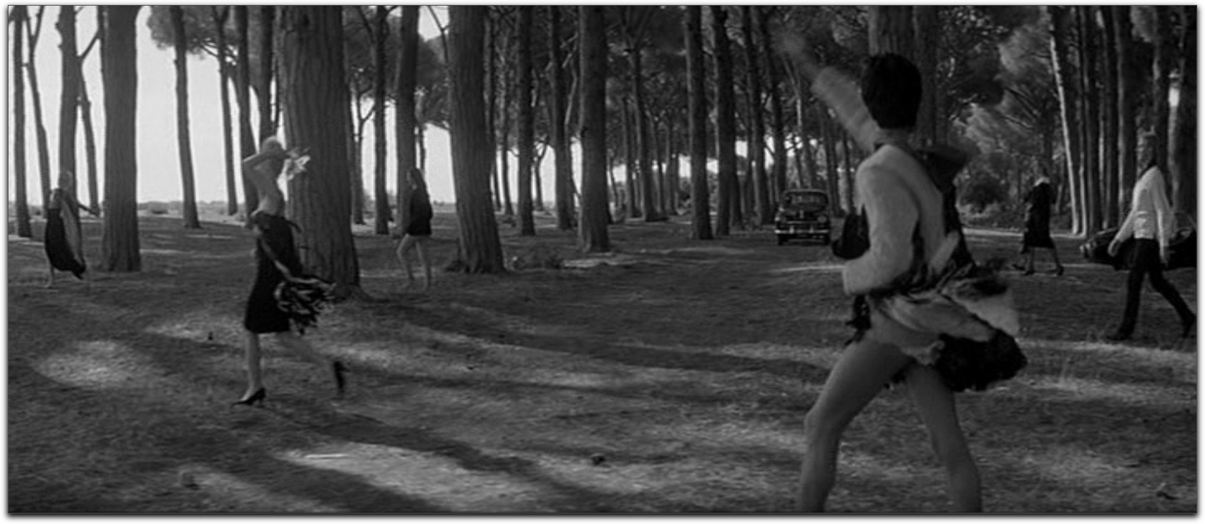 Roman ruins. Decadence. Modern life empty of meaning. The next vignette, he meets up with his friend Steiner who represents cold intellectualism devoid of religious faith. Fellini, raised Catholic, may have felt torn between being an intellectual, and being a devout believer in Christ and everlasting life.