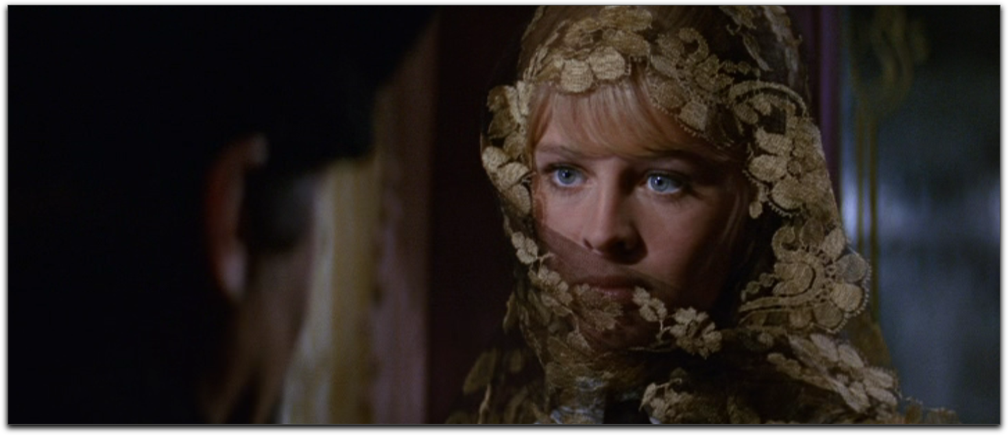Komarovsky puts a lace scarf on Lara, she looks almost Middle-Eastern, underscoring she is part of his harem, or her submissiveness.