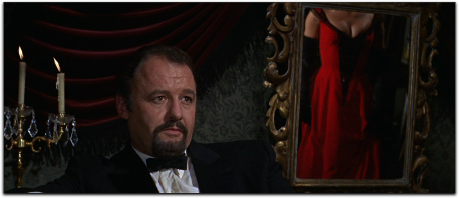 Lara is merely a piece of meat to him. Lean hints at this with just showing her body in the mirror, dressed in red.