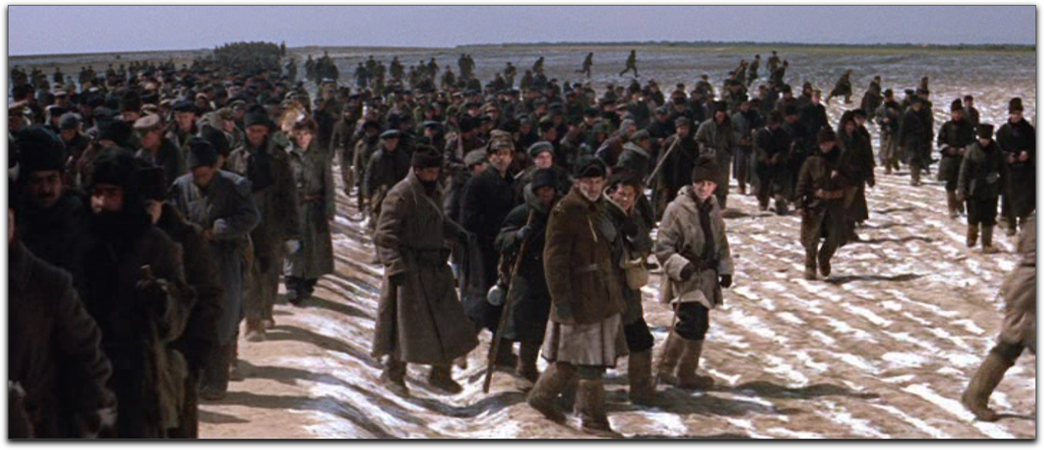 It is David Lean. He just couldn’t help himself. Here’s the long shot showing Yuri’s trail across the screen to show the vastness and how small the individual is in this society.