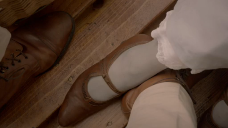 Tonya still stands out because she’s in color, albeit not as much as contrast as before, while those around her are in drab neutrals. This delicate pleated collar is a great detail.