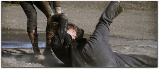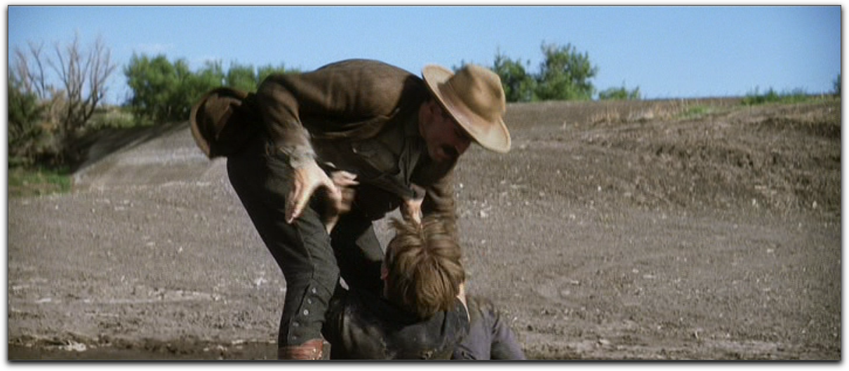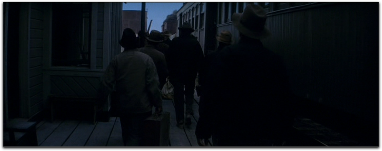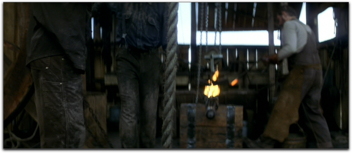 I LOVE this shot. Paul Dano looks like he's in a Magritte painting. I'm sure P.T. Anderson was trying to convince himself that it would be OK if Dano wore a bowler hat. But, no, a rural preacher would not. Speaking of surreal, it must've been for the Sunday family. There's oil all around them but they can't make any money off it.