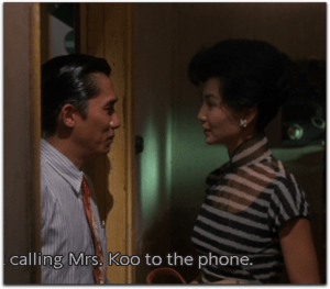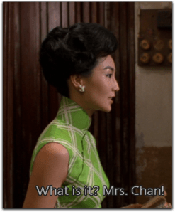 Mr. Chow meets Su Li-zhen, Gong Li, a professional gambler, in Singapore. She coincidentally has the same name as Maggie Cheung’s, Mrs. Chan, the reason he left for Singapore. Ms. Su helps him win back his money to return to Hong Kong.