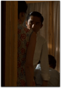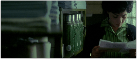 Mr. Chow bonds with the apartment owner’s daughter Jing-Wen, Faye Wong. She is heartsick over her Japanese lover whom her father forbade her to see. They work on martial arts books together. Platonic relationships with women is where Mr. Chow finally shows some humanity.