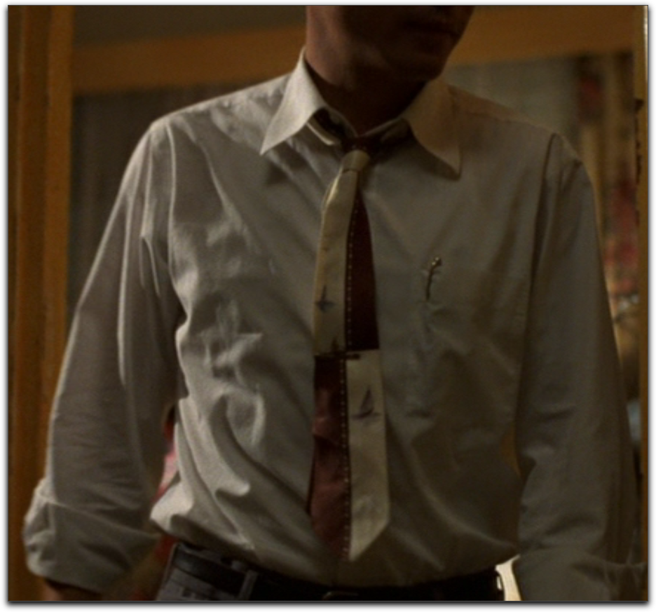 He offers his address so her Japanese lover can send her letters. This is a tough look to pull off, brown suit with orangey/rust tie. But he looks fab.