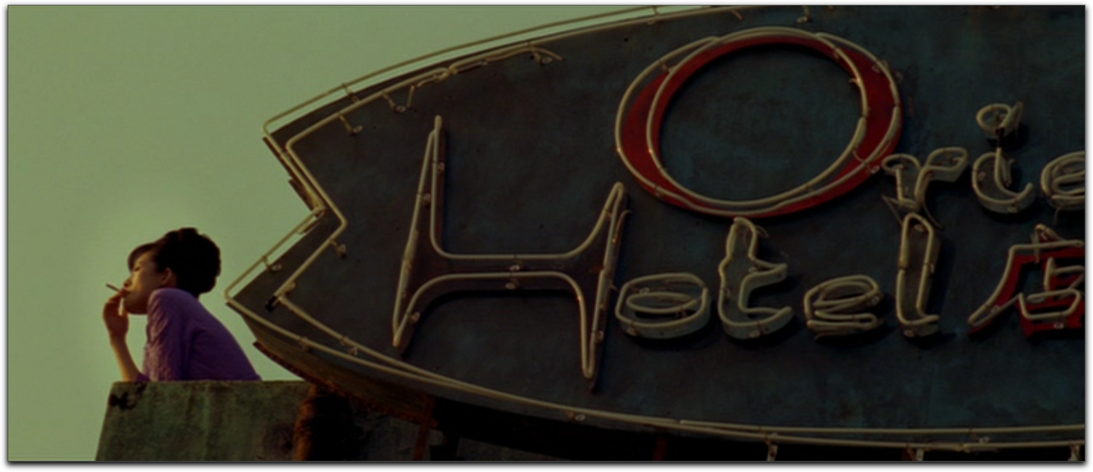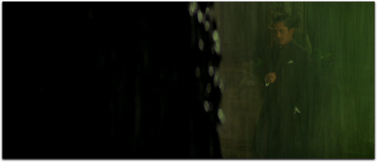 He watches Jing talk to her lover on a long distance call. The green and red lights in the background are Christmas lights, but they're also the main color story in the film.