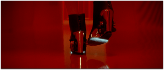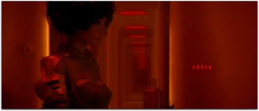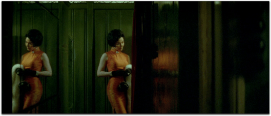 Mr. Chow continues to bed women like this one waiting to join him. Bai eventually moves out, tortured by his games. I like this shot because androids are used in the futuristic scenes as replacements for women, and with her reflection, it subtly says this woman might as well be a clone or robot sent to pleasure Mr. Chow. He won't give a second thought about her once she's gone. He'll just get another one just like her.