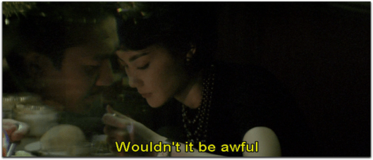 I love how this conversation is shot. Mr. Chow convinces Jing to call her lover. When the camera pans, the reflections overlap and the effect is powerful. Mr. Chow is an author. He writes his character's destinies. Here he is "writing" Jing's destiny, and his role in fantasy and reality are morphing into one another.